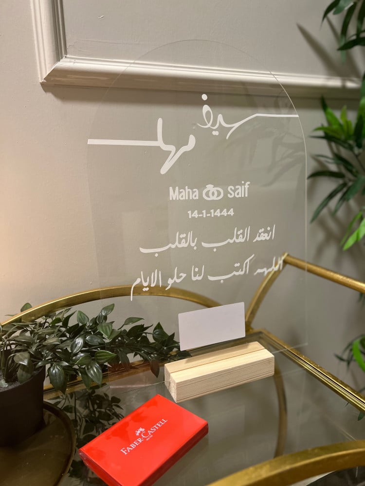 لوح اكريلك مقاس 3A يمكن تنفيذ اي عباره عليه ترحيب او عقد قران او مواليد بقاعده خشبيه * يمكن اختيار حبر التبصيم الرجاء ارفاق كافه التفاصيل عند الطلب