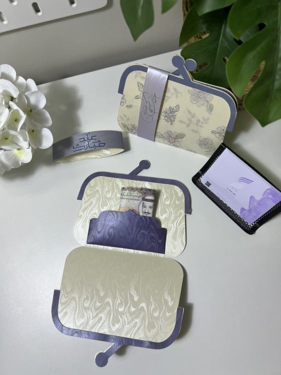 تميزي بعيدياتك بطاقات على شكل حقيبه ورقيه مميزه بداخلها جيب لوضع العيديه يمكنك اختيار الالوان وتغيرها واضافه اسماء او عبارات