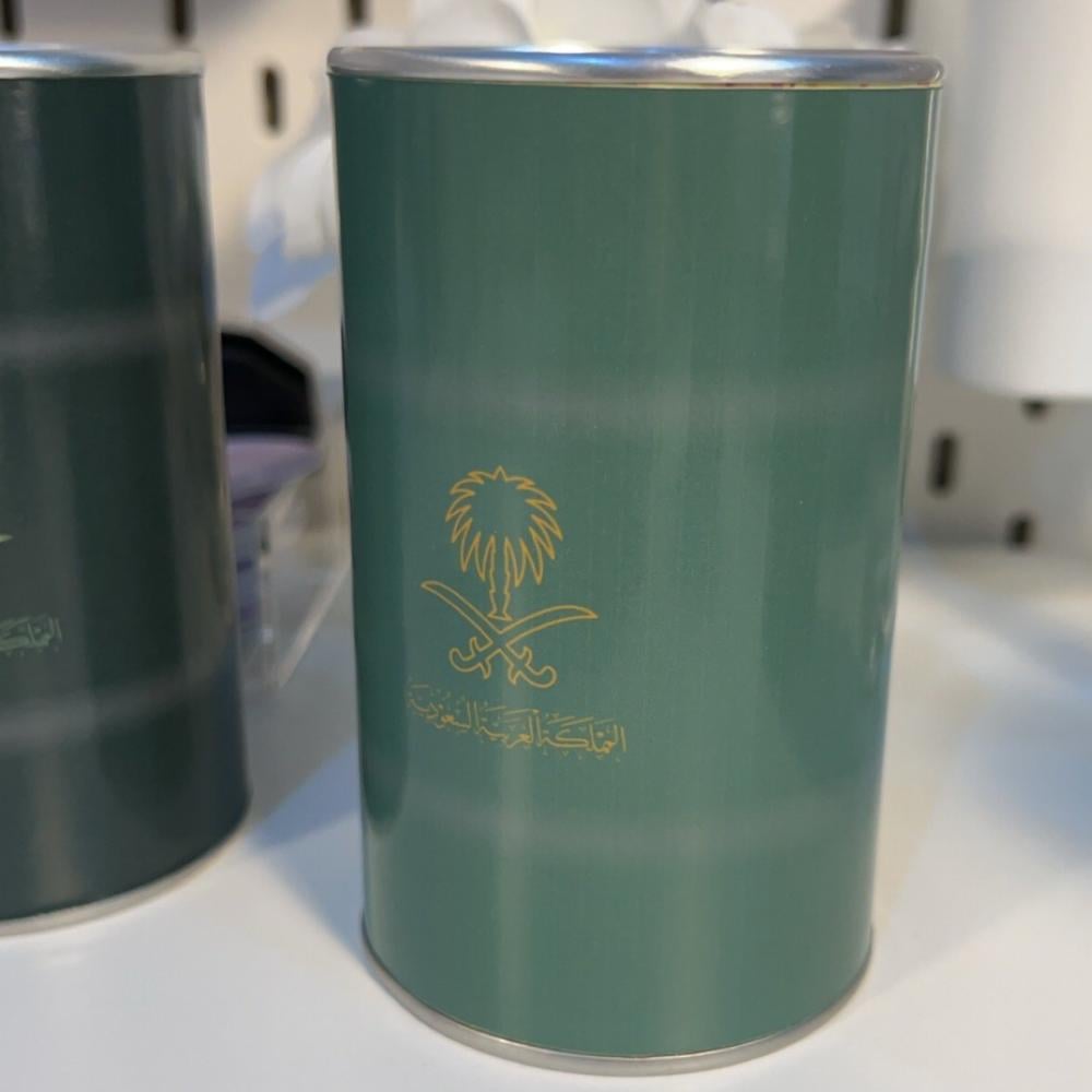 توزيعات لليوم الوطني السعودي بشكل مميز وفريد عباره عن علبه بطاطس ( شبس ) مغلفه على شكل برميل نفط .